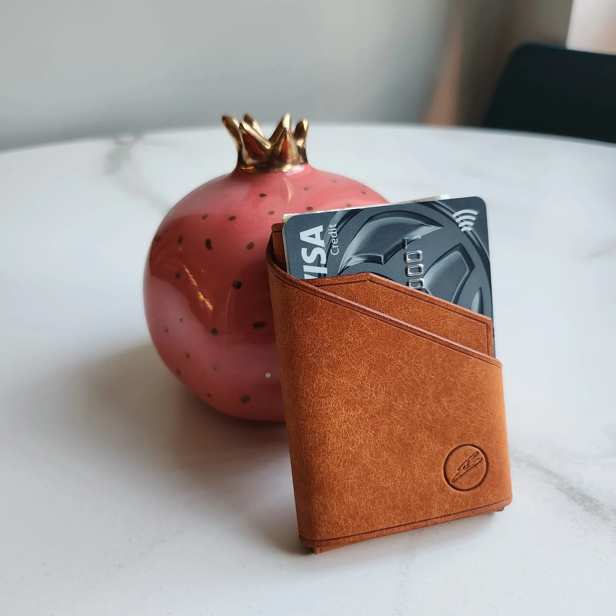 An aluminium “Pop Up“ card holder cased in full grain natural ves tan leather.